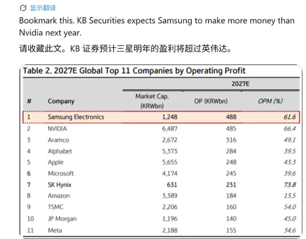 多家机构预测,三星 2026 年全年营业利润有望突破327万亿韩元,2027年或进一步攀升至488万亿韩元,有望超越英伟达成为全球最赚钱企业。