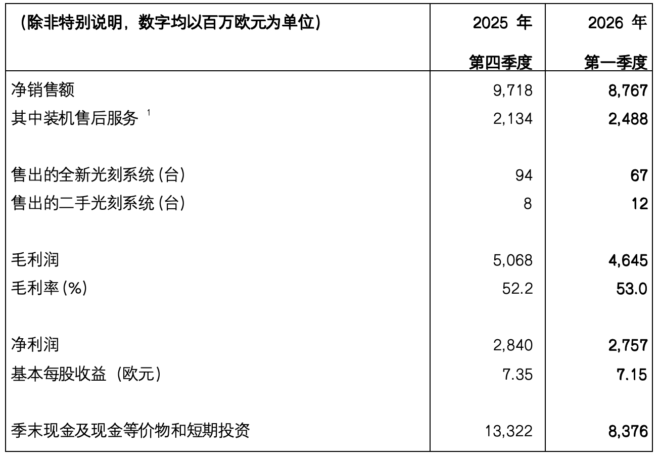 ASML总裁兼首席执行官傅恪礼(Christophe Fouquet)表示:"2026年第一季度ASML的净销售额为88亿欧元,符合我们的预期,毛利率达到53.0%,处于此前预测区间的高位。”