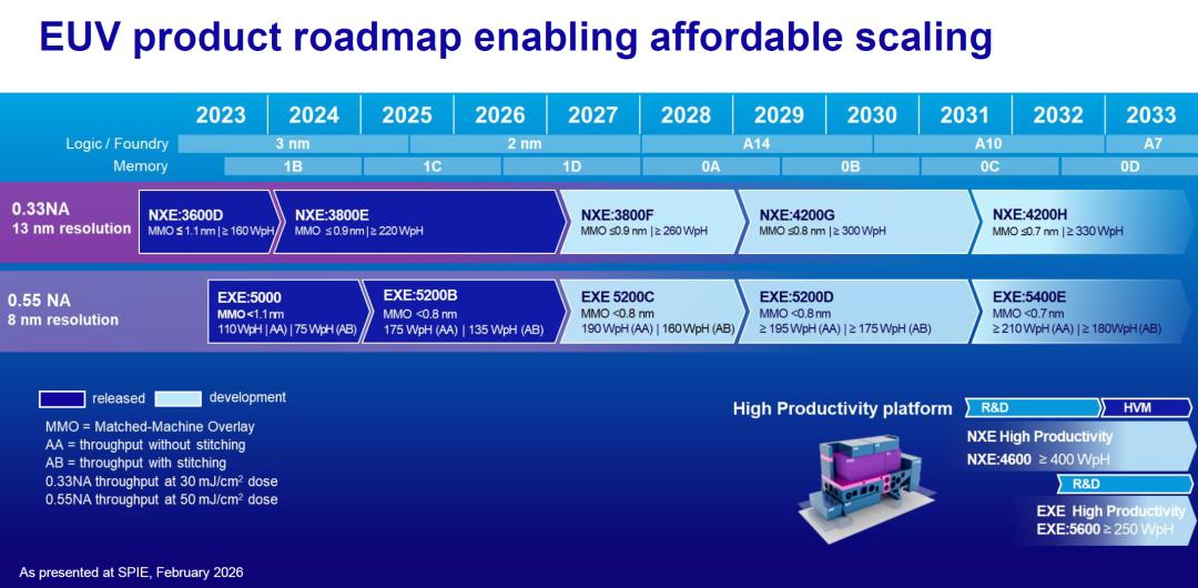 具体EUV的产品来看:①Low NA EUV(NXE:3800E)的技术成熟,是当前市场对EUV的主要需求,目前产能已经从220片/小时升至230片/小时。NXE:3800F更是升至260片/小时;②High NA EUV(EXE 系列):客户采购主要用于下一代技术的研发阶段,预计大幅出货将在2026年之后;
