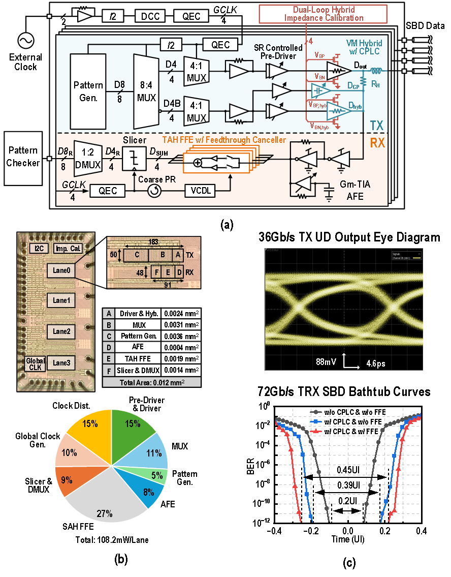 人工智能的爆炸式增长加速了高性能计算和高带宽互连的发展。为了持续提升互联接口的数据吞吐量,双向传输链路通过在信道两端同时发送和接收数据,显示出将系统吞吐量翻倍的潜力。然而,高速双向链路的设计面临着来自出栈信号的高频泄露问题和出入栈信号解耦系数精度问题。针对这两个双向传输链路的技术难点,南方科技大学团队提出了一款72Gb/s/pin的双向传输收发机芯片,其中采用了两项关键技术:一是电容峰化泄露消除技术,通过提取并前馈反相的高频泄漏分量来抑制高频泄露,将高频泄漏幅度从 148mV 降低到 55mV,抑制约63%,实现6倍的眼图开眼幅度的提升;二是双环路阻抗校准技术,使 hybrid 驱动阻抗能够同时跟踪主驱动和 的变化,从而提高出栈信号的消除精度,双环路阻抗校准技术在变化 20% 时将残余误差从最高 60mV 压低到 5mV 以下,降低约 92%。测试结果表明,通过使用所提出的关键技术,结合接收端FFE,该收发机芯片在72Gb/s的数据率下实现了0.45UI的无误码区间,接收端眼高提升至约 244mV,整体能效达到 1.5pJ/b,显示出其在高带宽密度芯粒接口中的竞争力。图2展示了双向传输芯片的电路架构图,功耗分布图以及测试结果。