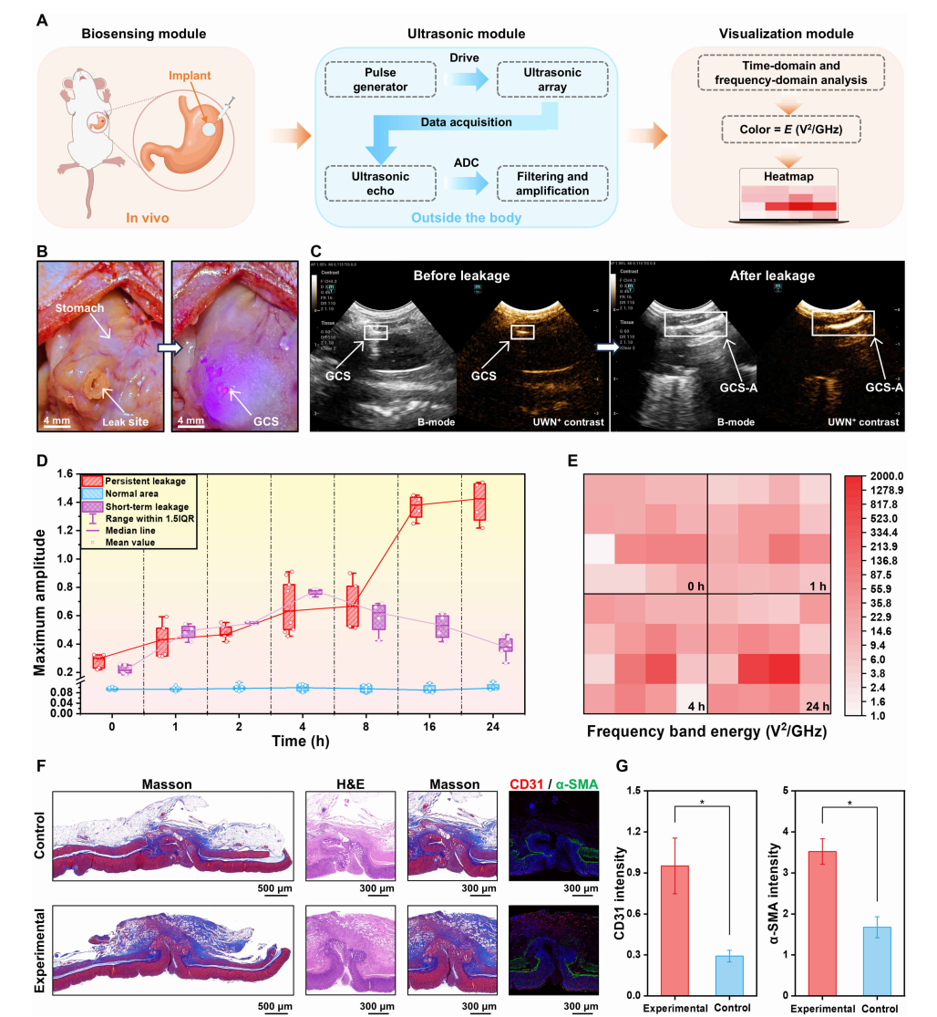 针对这一难题,团队设计了一种由明胶甲基丙烯酸酯(GelMA)、海藻酸钠(SA)和碳酸钙纳米颗粒(CaCO₃ NPs)组成的水凝胶(GCS)。手术时,将预凝胶溶液涂覆于吻合口,紫外光照射20秒即可原位固化,形成密封层。一旦胃酸渗漏,水凝胶中的碳酸钙迅速与酸反应产生二氧化碳(CO₂)微泡,同时释放的钙离子触发海藻酸钠二次交联,形成更致密的双网络结构(GCS-A)。这一过程实现了两大核心功能:封堵效果增强与声学指示。二次交联使水凝胶的杨氏模量提升约2.38倍,粘附强度达21.7 kPa,在离体猪胃漏模型中,24小时内泄漏量小于0.6克,远低于传统材料(>8.8克);此外,原位生成的CO₂微泡具有显著的声阻抗差异,其非线性振动可将超声回波的二次谐波信号能量提升32倍,使泄漏部位在B超和超宽频非线性(UWN)对比成像中清晰可见。此外,该水凝胶具有良好的生物可吸收性,胃壁植入实验显示,水凝胶在4周内基本降解,且能促进伤口愈合(CD31和α-SMA表达显著上调)。