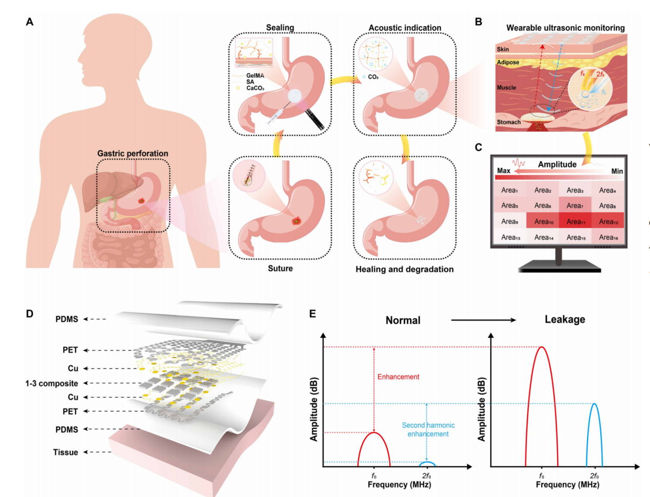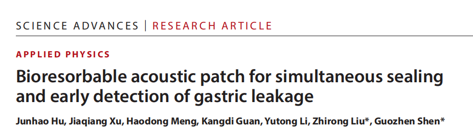 近日,北京理工大学集成电路与电子学院柔性电子器件与智造研究所沈国震教授团队在国际知名期刊《Science Advances》上发表题为“Bioresorbable acoustic patch for simultaneous sealing and early detection of gastric leakage”的研究论文。该研究首次将酸响应声学水凝胶与可穿戴柔性超声阵列相结合,实现了术后吻合口漏的无线、无创、持续监测与主动封堵,为胃外科术后管理提供了全新范式。