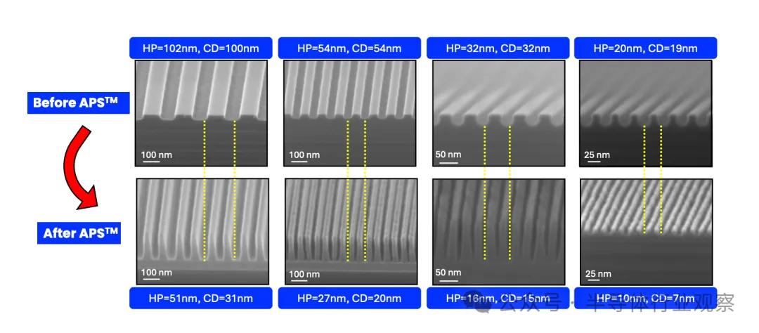 APS是纳米压印光刻(NIL)的强力补充,可以扩展密集的线条图案分辨率。可以作为传统多重图形化技术(如 SADP、SAQP 和 LELE)的替代方案,具有降低成本、提升分辨率和更好可持续性的潜力。