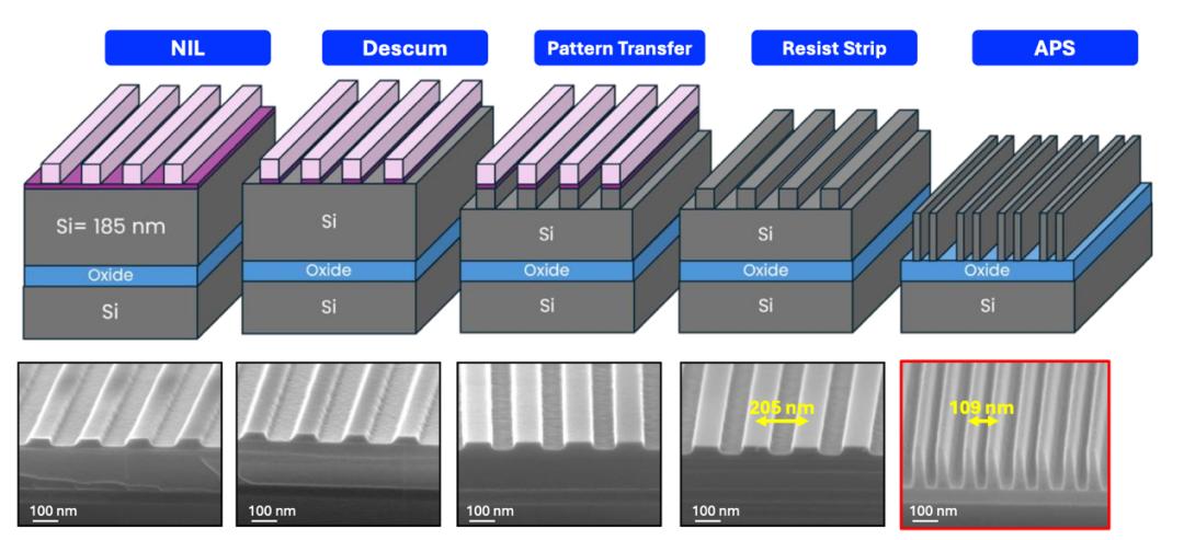Alixlabs也演示了APS如何嵌入真实工艺流程,其大致的流程是:NIL(纳米压印)→ 清理残胶 → 图形转移 → 去胶 → APS,即先用传统方法做出还不够细的结构,再用APS在已有结构上做原子层刻蚀分裂,结果能够实现从205 nm → 109 nm,直接减半,而且无须光刻。