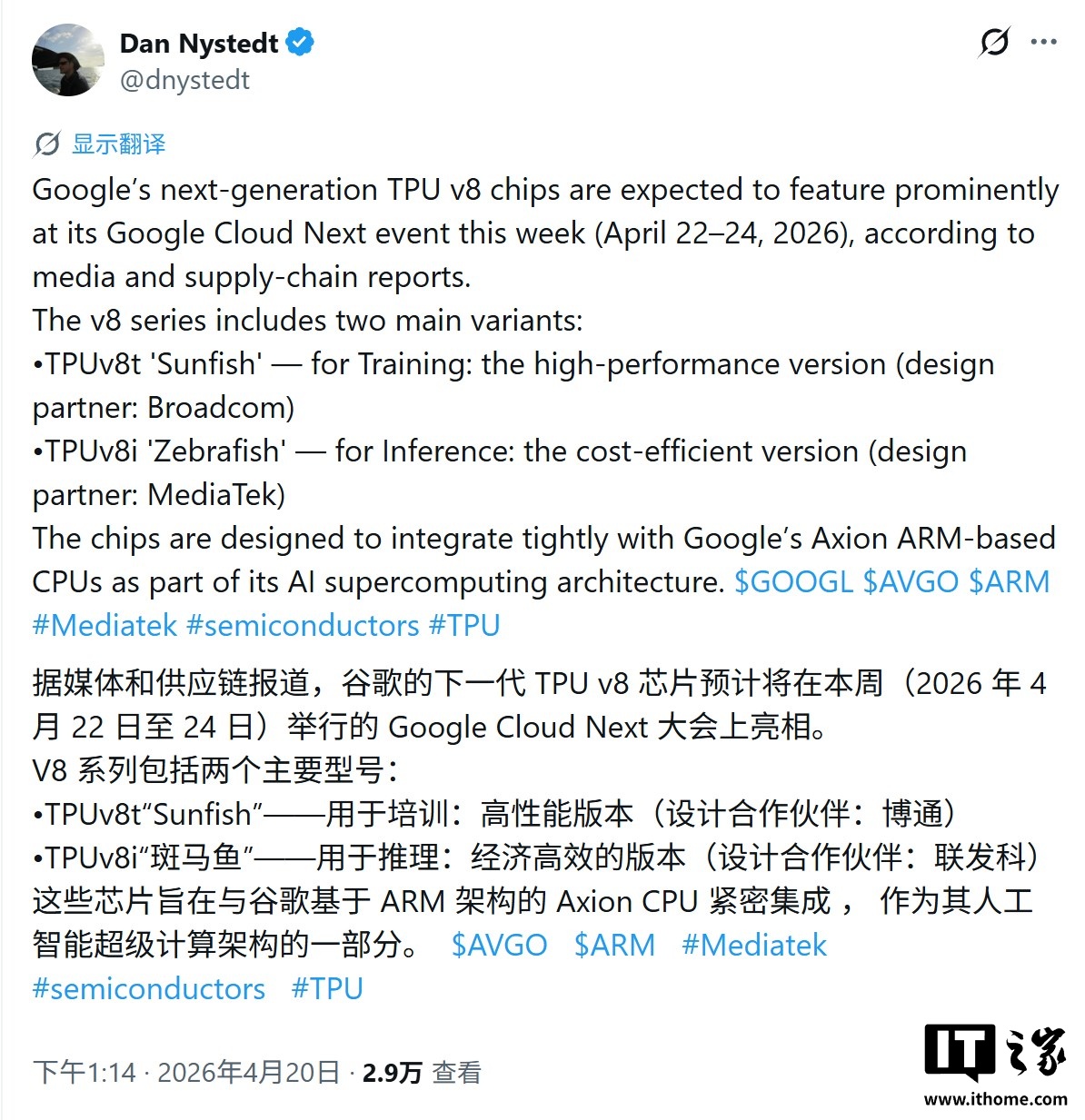 IT之家 4 月 21 日消息,科技媒体 Wccftech 昨日(4 月 20 日)发布博文,报道称在 TPUv8 战略上,谷歌针对不同 AI 场景,推行“双芯片”策略:其中 TPUv8t 由博通设计,专注高性能训练;TPUv8i 由联发科设计,主打高性价比推理。