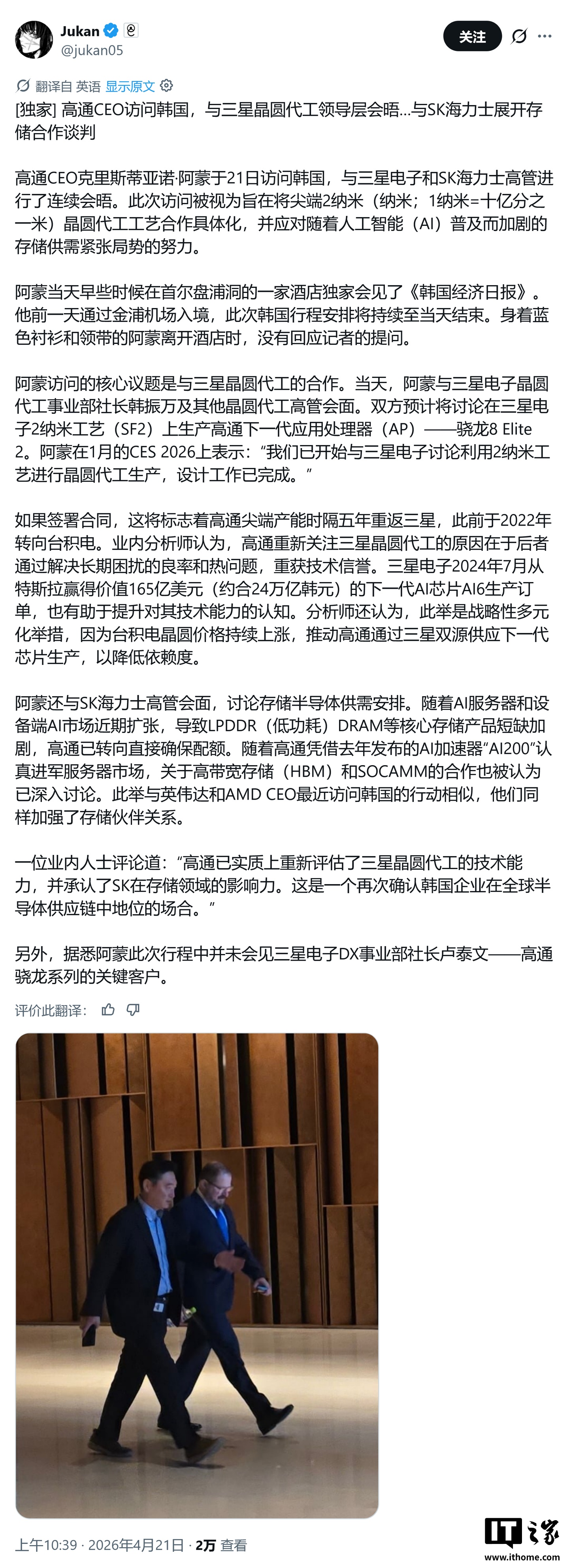 IT之家 4 月 21 日消息,科技媒体 Wccftech 今天(4 月 21 日)发布博文,报道称高通首席执行官克里斯蒂亚诺 · 阿蒙(Cristiano Amon)已于今天抵达韩国,将和三星、SK 海力士、LG 等公司高层会谈。