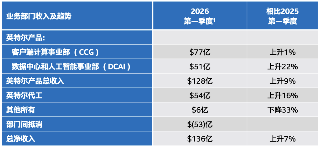 由于Altera已从2026年财务报表中解除合并,2025年合并财务报表的一季度同比数据不再具有直接可比性。Altera此前为英特尔全资子公司,自2025年9月12日起,在Altera所发行的51%普通股完成出售后,其已从英特尔的合并财务报表中剥离。截至2025年9月11日,Altera的经营业绩均包含在英特尔的合并财务业绩中,并归入“其他所有”业务单元类别。