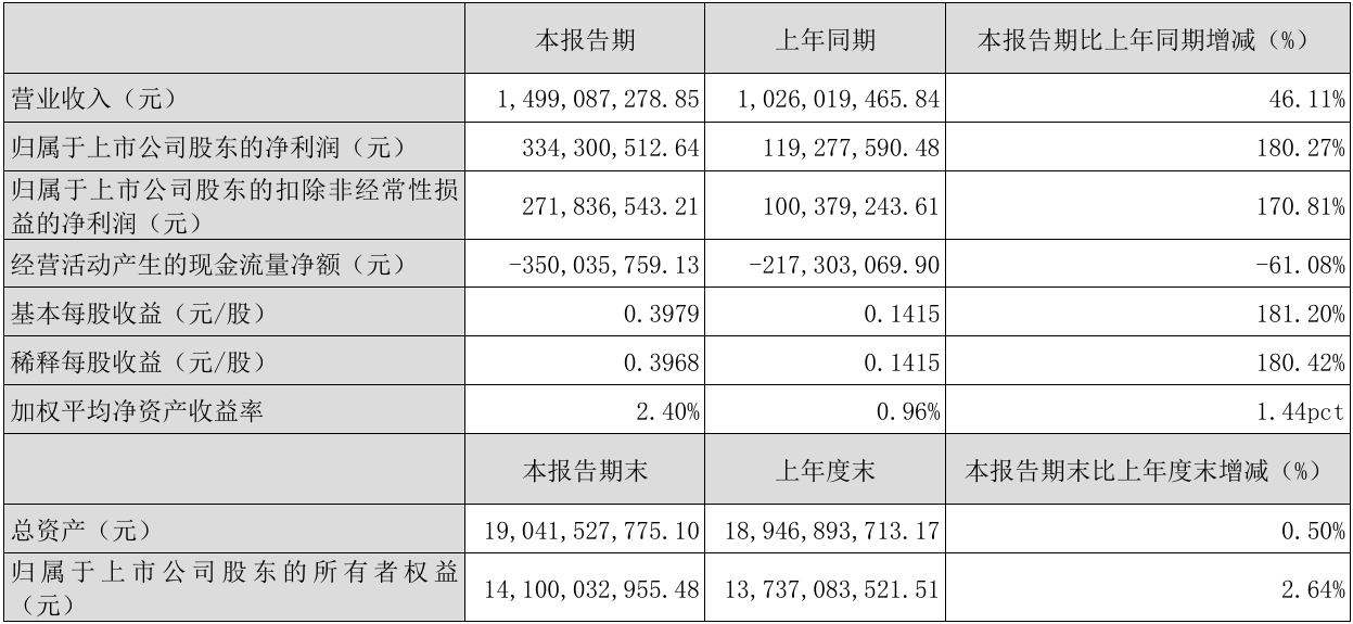 从盈利能力指标来看,基本每股收益为0.3979元,上年同期为0.1415元,同比增长181.20%;稀释每股收益为0.3968元,上年同期为0.1415元,同比增长180.42%;加权平均净资产收益率为2.40%,较上年同期的0.96%提升1.44个百分点。