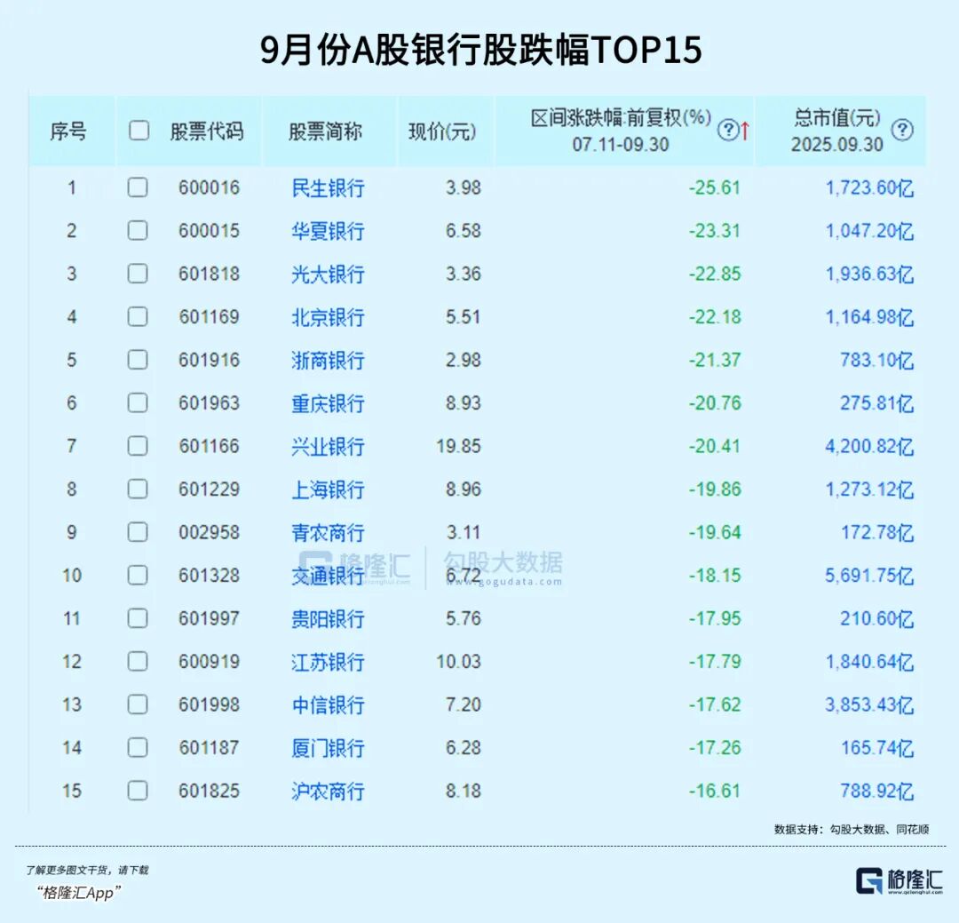 今年1-7月中旬,银行板块累计上涨超20%。然而随着A股行情越发走牛,市场风险偏好提升,大规模资金开始充银行撤出转向其他热门赛道,资金长期抱团的银行股也由此持续回调,38 家上市银行更是集体连跌三月。其中,民生银行、华夏银行、光大银行、北京银行等近十股期间累计回调超过20%。完全错过了这一轮牛市中涨势最舒服的阶段。