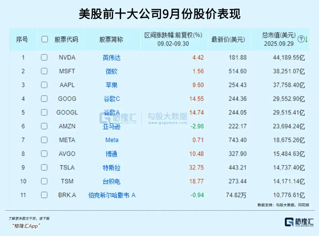 其中,美股科技巨头们表现多数亮眼。截至9月30日,美股股王英伟达月内涨幅约4.5%,苹果月内涨幅9.6%,谷歌、博通、台积电等月内涨幅均超过10%。最亮眼的无疑是特斯拉,月内涨幅达到了近33%,市值月内增加了近4千亿美元。