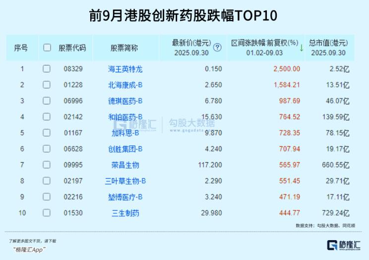 2025年,是A港股创新药板块表现最强势的罕见阶段。从年初至9月初,单是A股就有超过50只创新药股涨幅翻倍,舒泰神、一品红、塞力医疗等多股涨幅超3倍。港股的上百只创新药股中甚至一度有近60股翻倍,占比超过50%!其中海王英特龙、北海康成-B两只微盘妖票涨幅分别高达25倍、16倍,还有超十股涨超4倍。