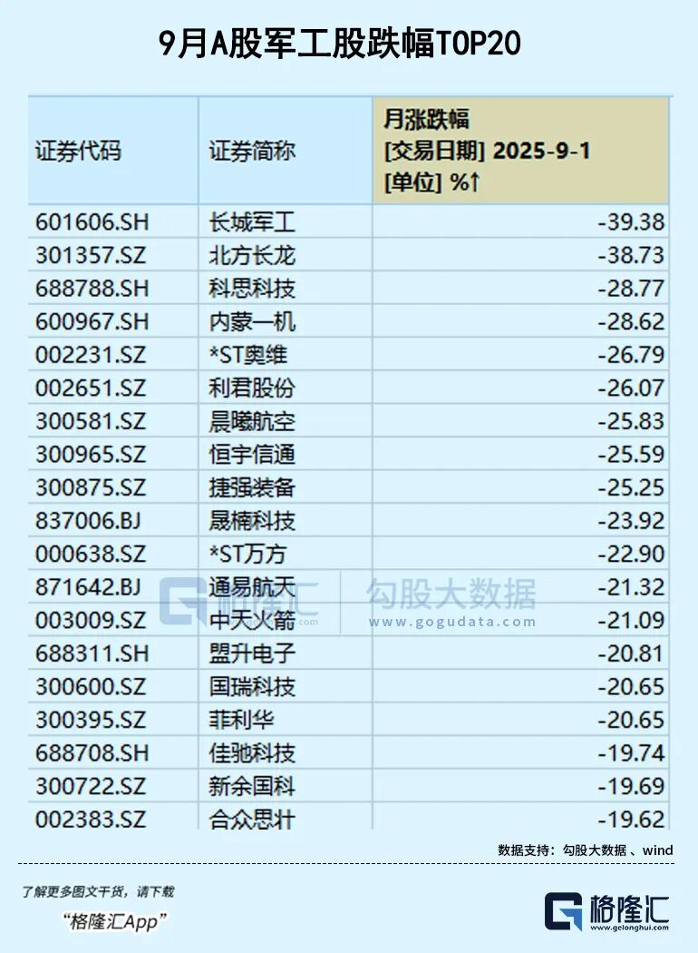 然而随着重大事件落地,军工股也快速回调,成为了9月份跌幅最大的热门板块,板块内近70只军工股在月内几乎无一上涨,尤其长城军工、北方长龙两只此前疯狂飙升的妖股,本月最大回撤幅度都超过了40%。然而从依旧相对起点有巨大涨幅、以及业绩面依旧处于亏损状态的这些军工龙头,回调是否已经结束?需要打一个大的问号。