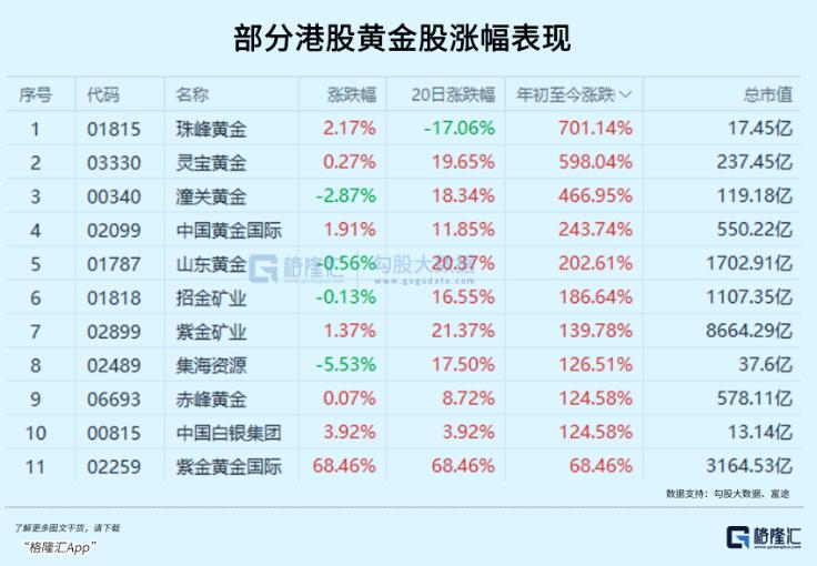 A股涨势突出的公司包括西部黄金涨幅超过50%,晓程科技、中金黄金、湖南白银等涨幅在30%以上。港股的黄金股涨势更是用夸张来形容。珠峰黄金、灵宝黄金、潼关黄金、龙资源等年内涨幅超超过3倍。如果从年低点至最高价来算,一些贵金属概念股甚至最大涨幅超过10倍。