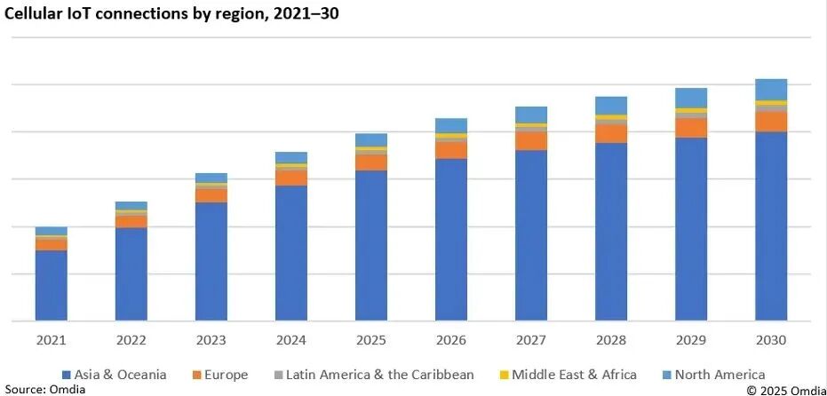 Omdia的研究写到,亚太和大洋洲地区占据2024年全球物联网模块出货量的67%以上,约占全球物联网连接总量的80%。其报告指出,随着行业为2030年后逐步淘汰4G网络做准备,5G RedCap提供了关键的保障长期可用性优势。
