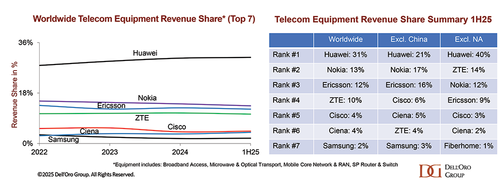 全球供应商排名基本保持稳定,但市场份额出现细微变化:华为持续扩大市场优势,而爱立信和诺基亚的市场份额较2024年水平略有下降。