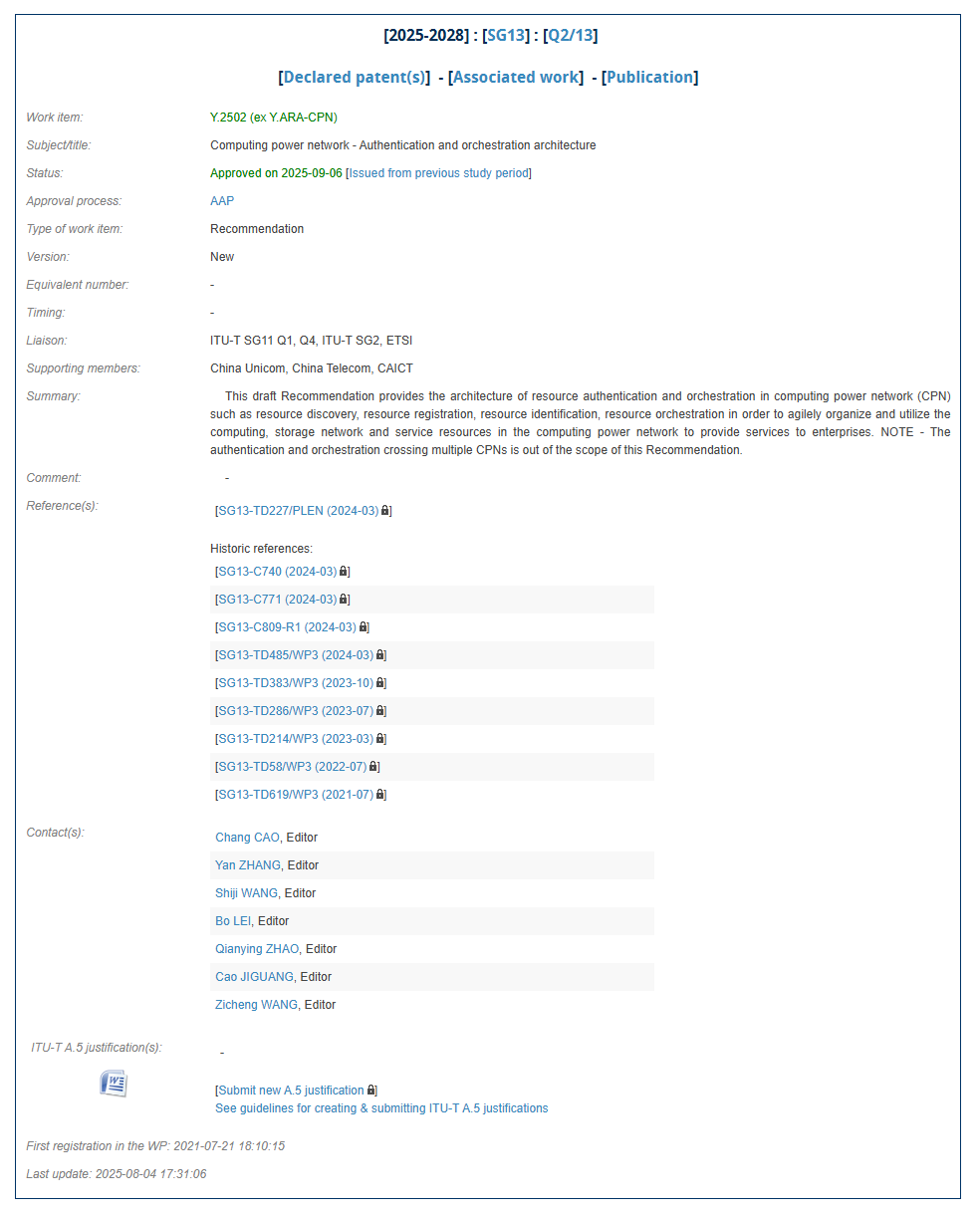 算力网络的核心价值在于打破计算、存储、网络资源的孤岛效应,实现跨域、异构资源的敏捷组织与优化利用。然而,多资源提供商共存、多管理机制并行、资源状态动态变化等特性,对资源合法性验证、高效调度编排提出了严峻挑战。ITU-T国际标准 Y.2502历经四年的技术研讨、方案迭代与细节打磨,最终于 2025 年9月达成共识并获得发布批准。作为首个聚焦算力网络资源认证与编排的国际标准,ITU-T Y.2502 明确了算力网络资源认证与编排的整体架构,涵盖 CPN 编排层、CPN 资源层、CPN 服务层等核心功能,定义了资源发现、注册、认证、编排、信息获取全流程服务逻辑,为不同厂商、不同类型资源协同提供了通用参考框架。