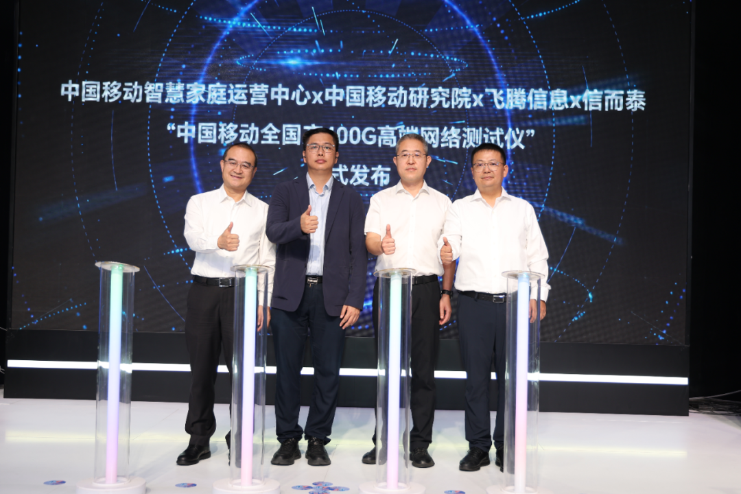 本次联合发布仪式上,信而泰董事长李占有先生作为代表之一,与合作伙伴的多位领导共同出席了发布环节。出席嘉宾包括:中移(杭州)信息技术有限公司集团首席专家、家庭算力及安全产品部总经理路晓明先生,中国移动通信有限公司研究院测试中心副总经理杨海俊先生,以及飞腾信息技术有限公司副总裁王亚松先生。各方领导共同手触启动屏,在全场倒计时中见证了这款国产高端测试仪表的正式发布。