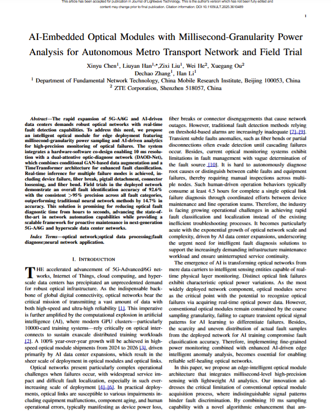 近日,中国移动研究院在50GE QSFP28光模块研究领域取得突破,成功在器件层面嵌入智能化能力,通过对光模块功率数据执行高精度采集和AI分析运算,可实时精准分类检测设备掉电、光纤中断、尾纤脱落、光纤弯折和连接器松动等5类基础故障,检测精度超95.6%,为光网络智能化运营提供了全新解决方案。相关研究成果“AI-Embedded Optical Modules with Millisecond-Granularity Power Analysis for Autonomous Metro Transport Network and Field Trial”发表于光通信领域国际权威SCI期刊《Journal of Lightwave and Technology》(影响因子4.8)。