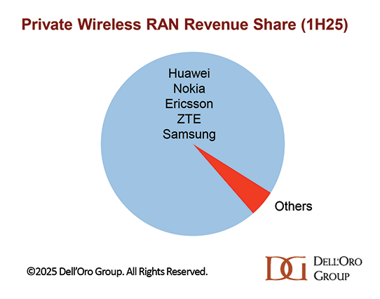 然而,专线专网RAN市场依然高度集中。在2025年上半年,相同的五家领先公网RAN供应商(华为、诺基亚、爱立信、中兴通讯、三星)继续主导着专网RAN市场格局。这种重叠反映了市场正从传统企业环境转向工业应用,而在工业应用中,规模、性能和集成要求更有利于成熟的供应商。