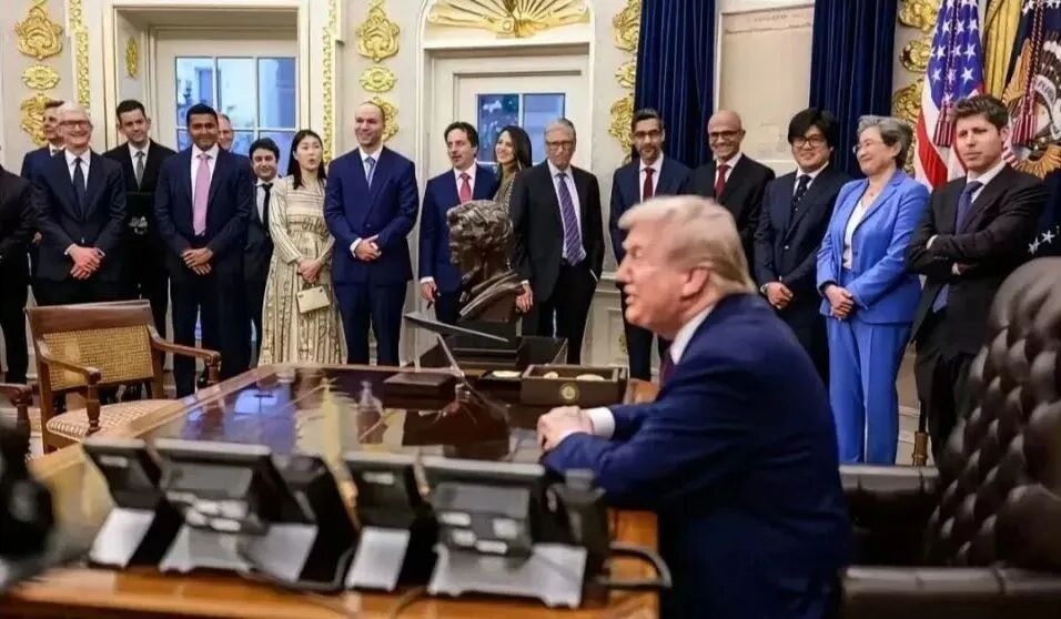 近期,特朗普在白宫宴请苹果、微软、Meta、谷歌等20余家科技巨头CEO,被外界称为现代版“鸿门宴”。晚宴上,特朗普称与会者为“最聪明的高智商群体”,扎克伯格、库克、盖茨、奥尔特曼等悉数到场