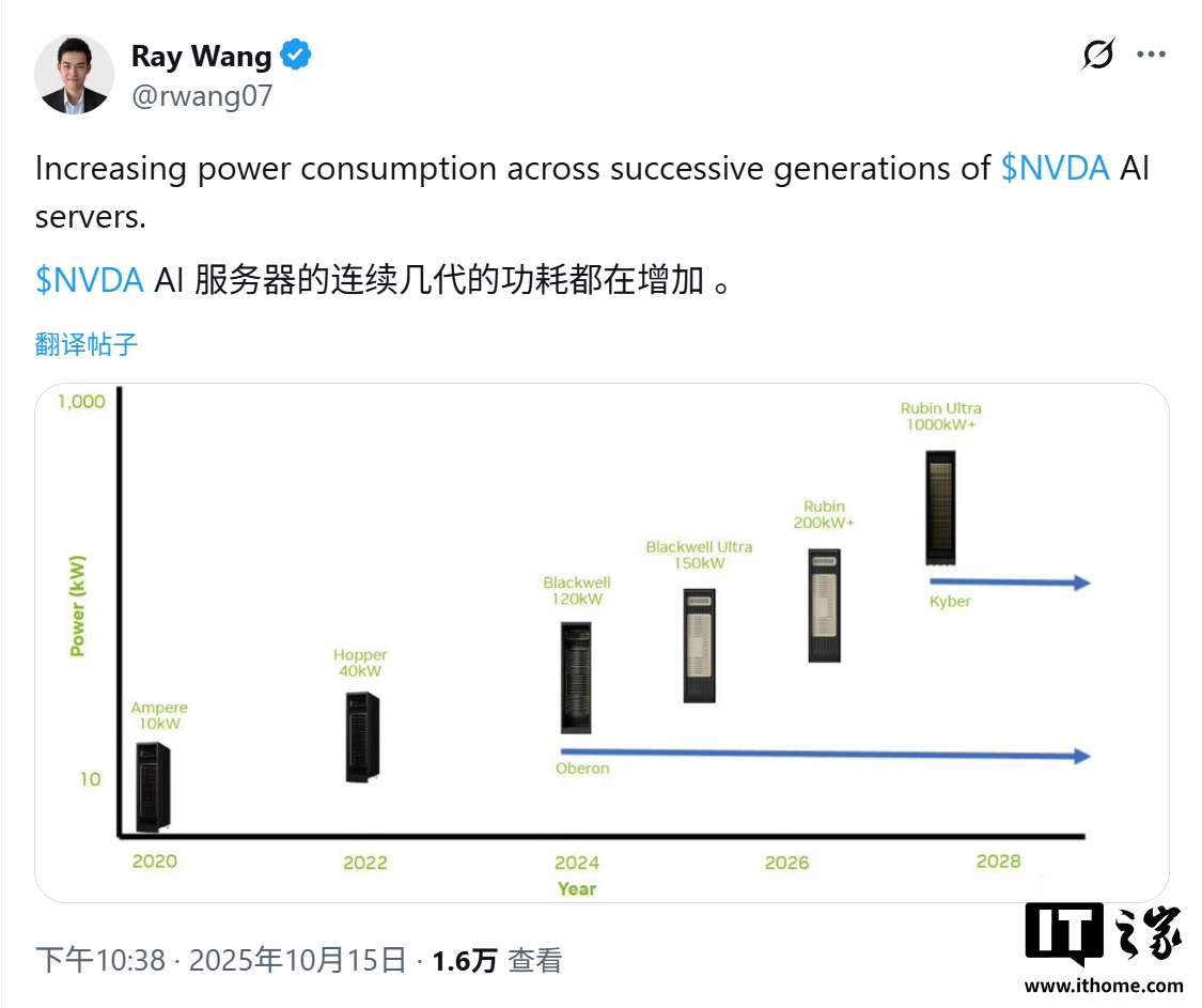 IT之家 10 月 16 日消息,行业分析师 Ray Wang 昨日(10 月 15 日)在 X 平台发布推文,报道称英伟达 AI 服务器功耗正以惊人速度增长,从 Ampere 架构到未来的 Kyber 架构,其机架级解决方案的功耗在短短八年内将飙升 100 倍。