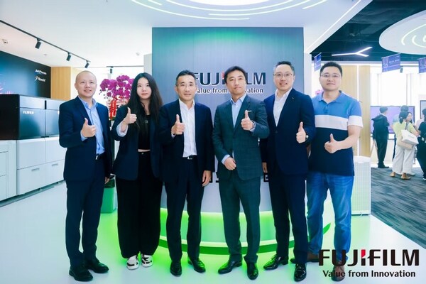富士胶片商业创新(中国)董事长兼总裁中村达也(左三)、 高级副总裁朱德康(右二)、华为终端BG业务发展部部长张京武(右三)