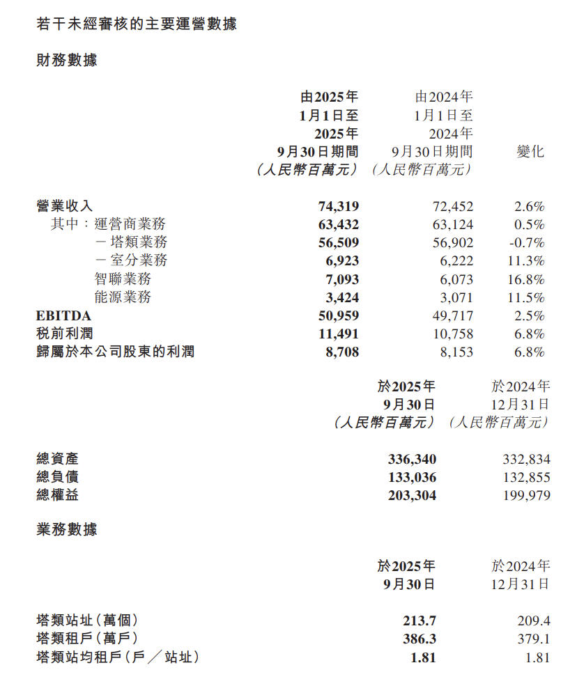 截至2025年9月30日,公司塔类站址数为213.7万个,塔类租户数为386.3万户,较上年末净增7.2万户,塔类站均租户为1.81户。