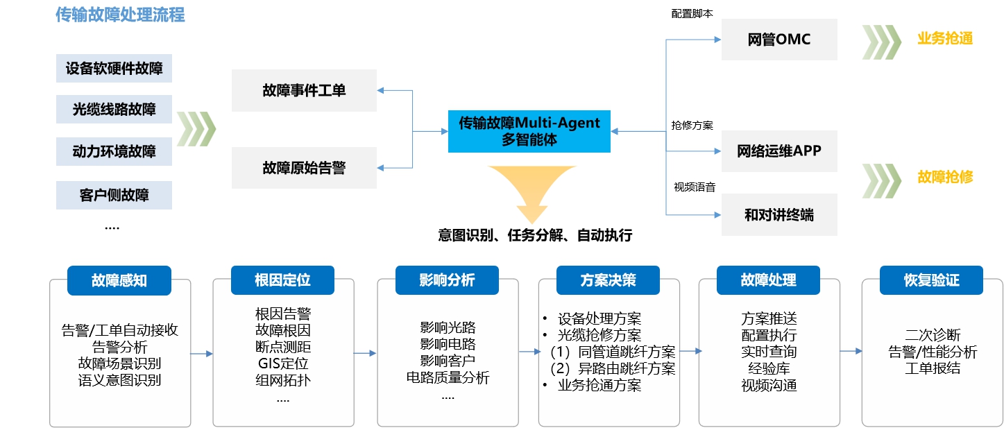 浙江移动联合中兴通讯、直真科技,聚焦传输网络故障场景,基于AI大模型技术及思维链灵活调用工具,打造首个融合传输设备、线路故障处理专家经验的Multi-Agent多智能体协作系统,实现“故障感知、根因定位、业务分析、方案决策、故障处置、恢复验证”端到端自动化,在网络故障处理领域打造“黑灯工厂”创新处理模式。该项目已在浙江移动全网部署,嵌入故障处理流程,月均处理超20000张故障工单,支持自动完成故障诊断、输出抢修/抢通方案并推送一线抢修人员手机APP,根因定位平均耗时从45分钟缩短至2分钟内,抢修方案输出从20分钟缩短至2分钟内,故障处理平均效率提升40%。