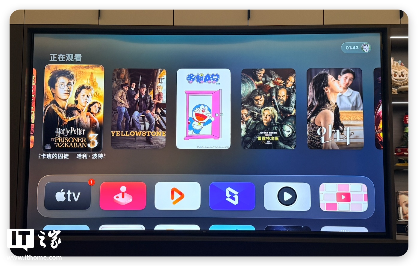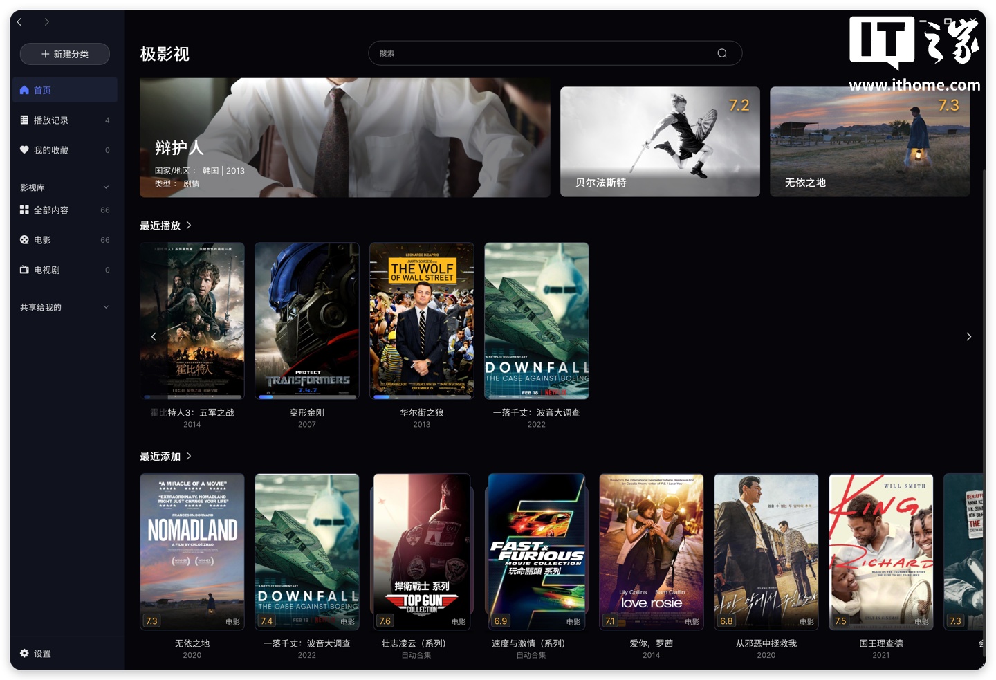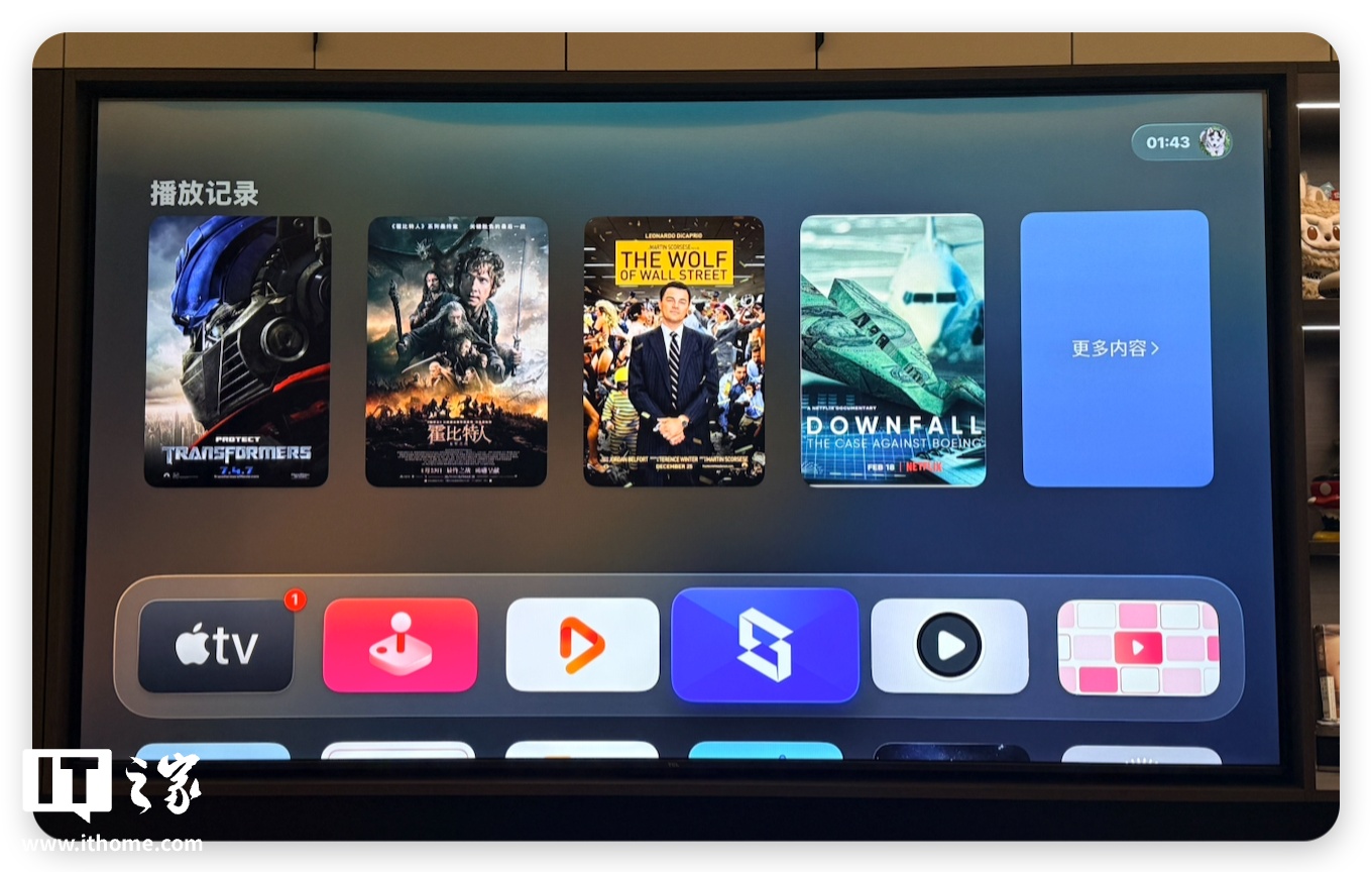 那么极空间在 Apple TV 上表现如何呢?我们先看看 UI,和 infuse 布局类似,并且在桌面也能够与 infuse 一样,直接显示最近播放的历史记录。