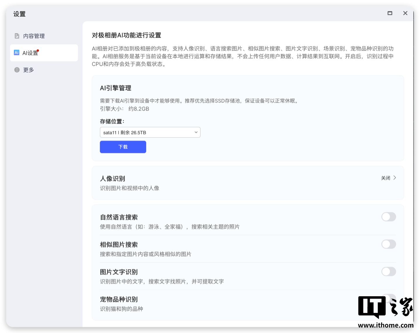 此外,极相册中还提供了 AI 引擎管理,首次使用需要先下载 AI 引擎,引擎有 8.2GB,下载后,就能够开启自然语言搜索、相似图片搜索、图片文字识别、宠物品种识别等一系列 AI 功能,并且识别都是基于本地模型在本地处理的,无需担心隐私安全,处理过程也是在后台无感进行的,对于图片、视频很多,且经常会新增照片的用户来说,大大降低了图库的管理难度,也提升了查找照片时的搜索效率。