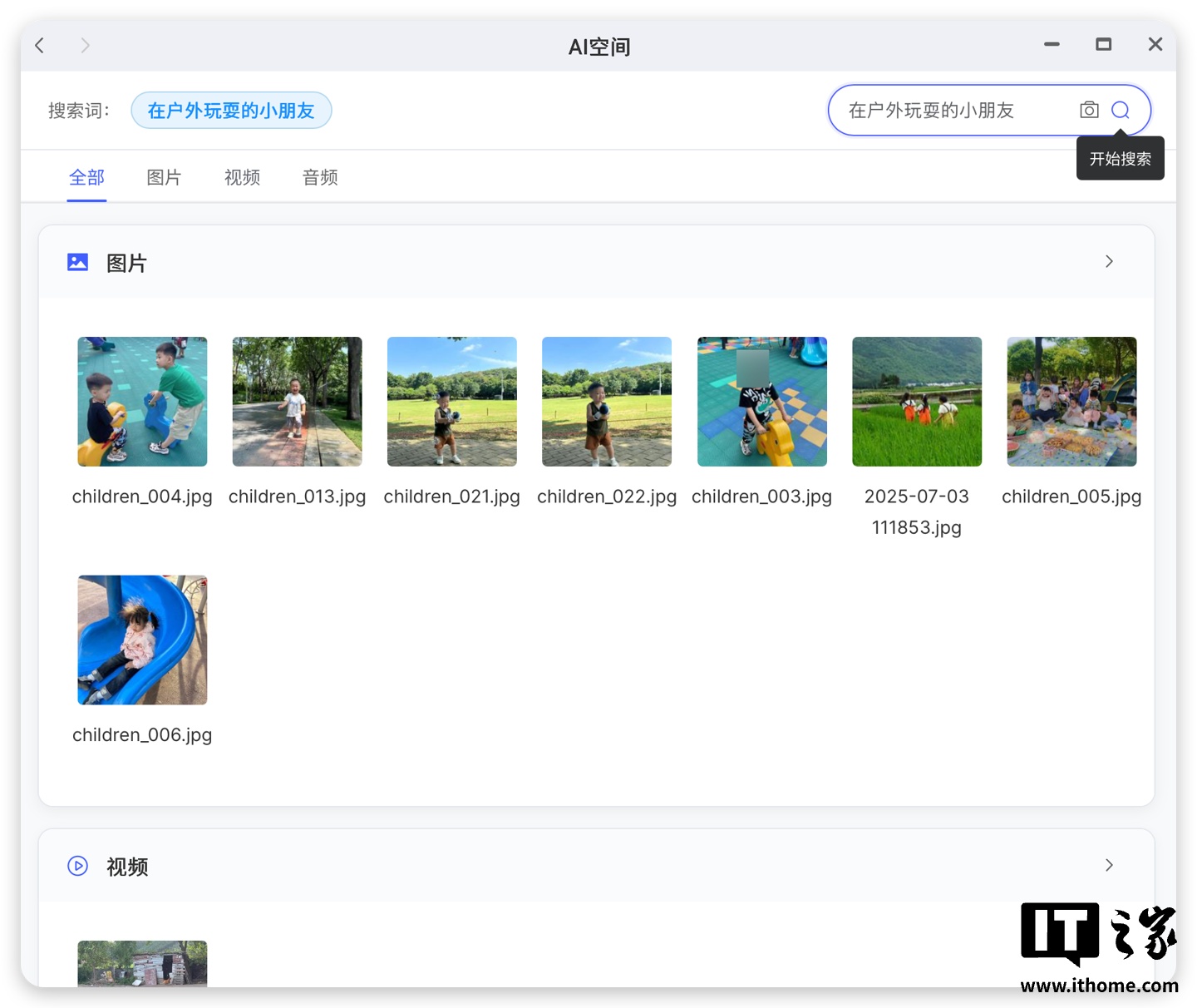 再比如搜索「在户外玩耍的小朋友」,同样能够准确搜索,这种自然语言搜索,对于照片量大且种类繁杂的家庭用户来说,再合适不过了,无需进行细致的分类,需要的时候按照记忆描述画面内容即可。