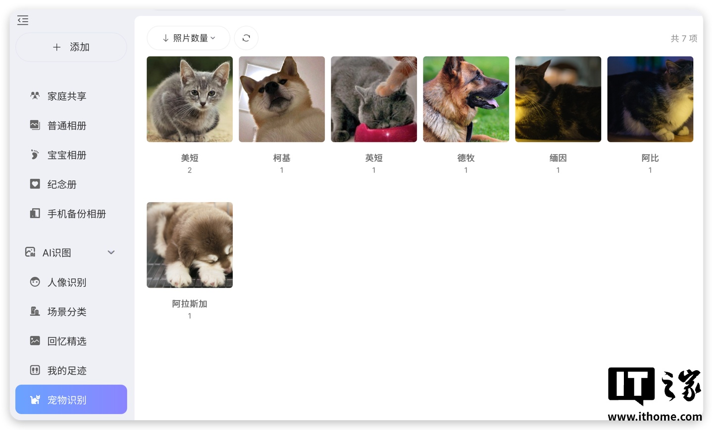 比较神奇的是这个宠物识别,不仅能够识别出包含动物的图片,还能识别出宠物的种类并自动分类。