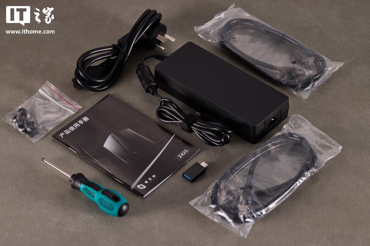 官方也配备了丰富的配件,包含两条六类网线、电源适配器、安装工具,以及一个 USB-C 转 A 的转接头。配合便捷的 UPS、硬盘快拆等设计,即使是完全没有接触过 NAS 的用户,基本也能够做到开箱无压力地上手安装、使用。