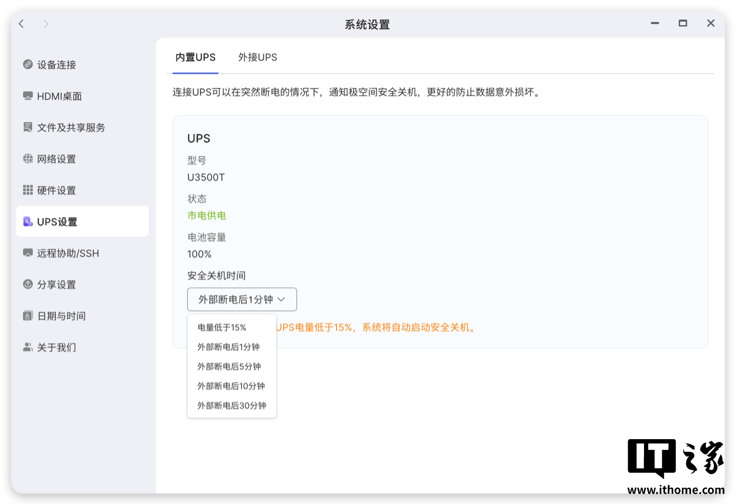 对于家庭用户来说,官方的这个小 UPS 的确是个不错的选择,既能够实现保护硬盘的作用,又不用额外占用过多空间,非常优雅,安装后,无需额外操作,就能够在系统设置里看到内置 UPS 激活的信息。