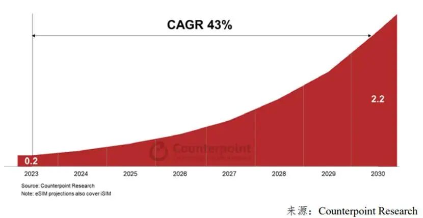 从过去发展历程看,物联网eSIM比手机eSIM商用相对顺利。Counterpoint数据显示,截止2023年底,物联网领域的eSIM连接数量接近2亿个。预计到2030年底,物联网领域eSIM连接数将达到22亿,年复合增长率达到43%。