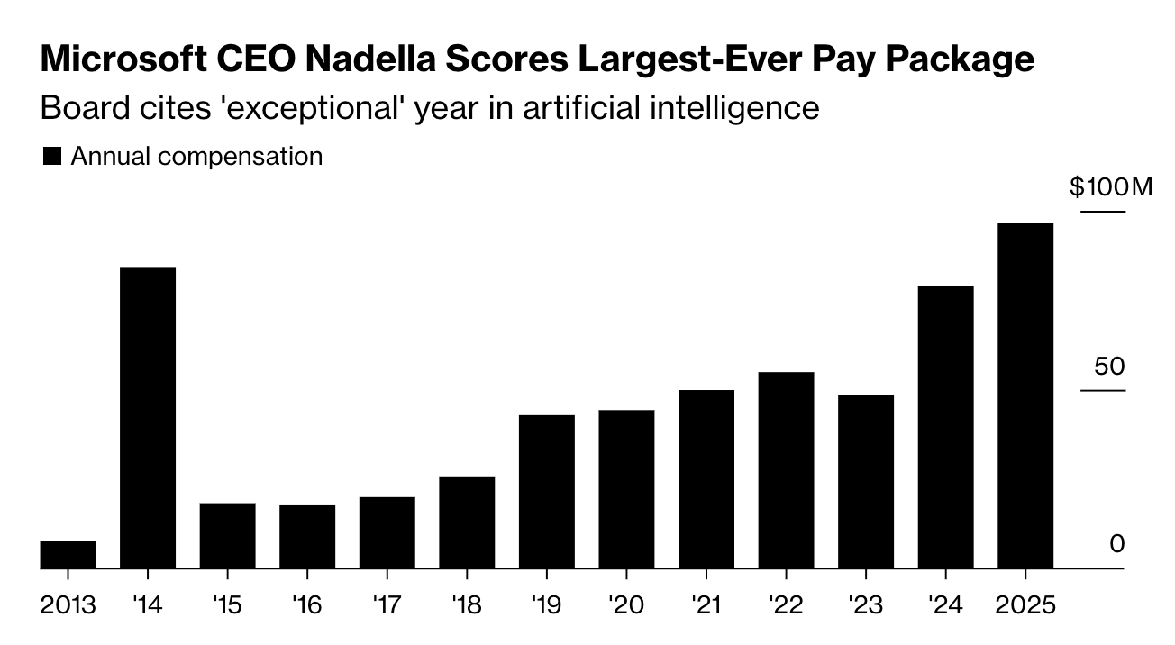 凤凰网科技讯 北京时间10月22日,据彭博社报道,微软公司CEO萨提亚·纳德拉(Satya Nadella)的2025财年薪酬飙升至9650万美元(约合6.87亿元人民币),创下他自十多年前担任CEO以来的最高薪酬。微软董事会指出,纳德拉带领公司在AI领域取得了“非凡”的年度进展。