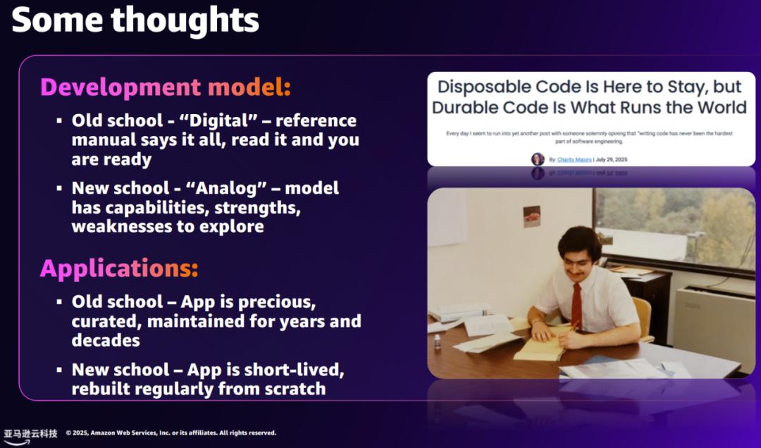 「未来,可能会有某些应用,我们将其视为即用即抛的。」Jeff Barr 预测道,「我们会构建它、使用它,但不再考虑长期维护。当需求变更时,我们只需回到规范层面进行修改,然后让 AI 重新生成一个全新的、更好的版本。」