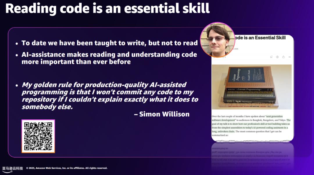 「在这个过程中,开发者仍然是掌控者,」Jeff Barr 强调,「AI 是你的助手,而不是你的替代者。它在放大你的技能,而不是取代它们。」