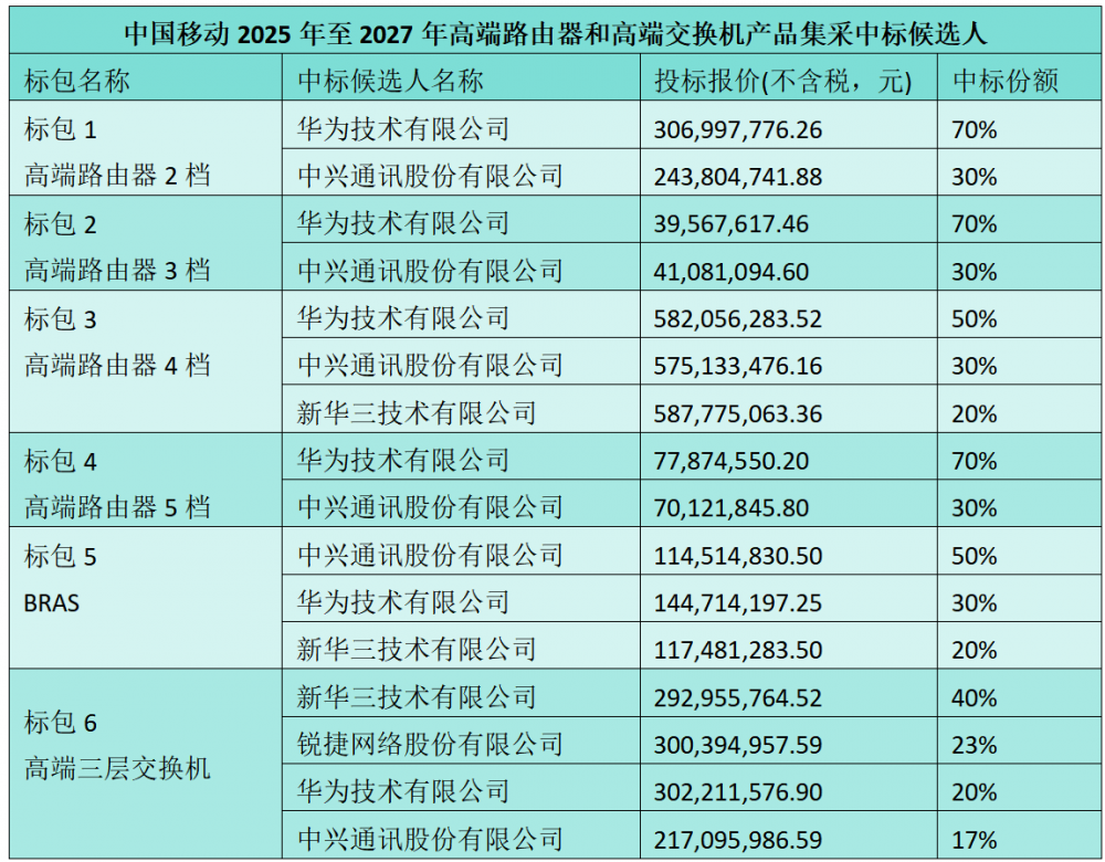 C114讯 10月28日消息(九九)中国移动采购与招标网日前发布2025年至2027年高端路由器和高端交换机产品(新建部分)集中采购项目标包1、3、5中标候选人公示,华为、中兴、新华三中标。