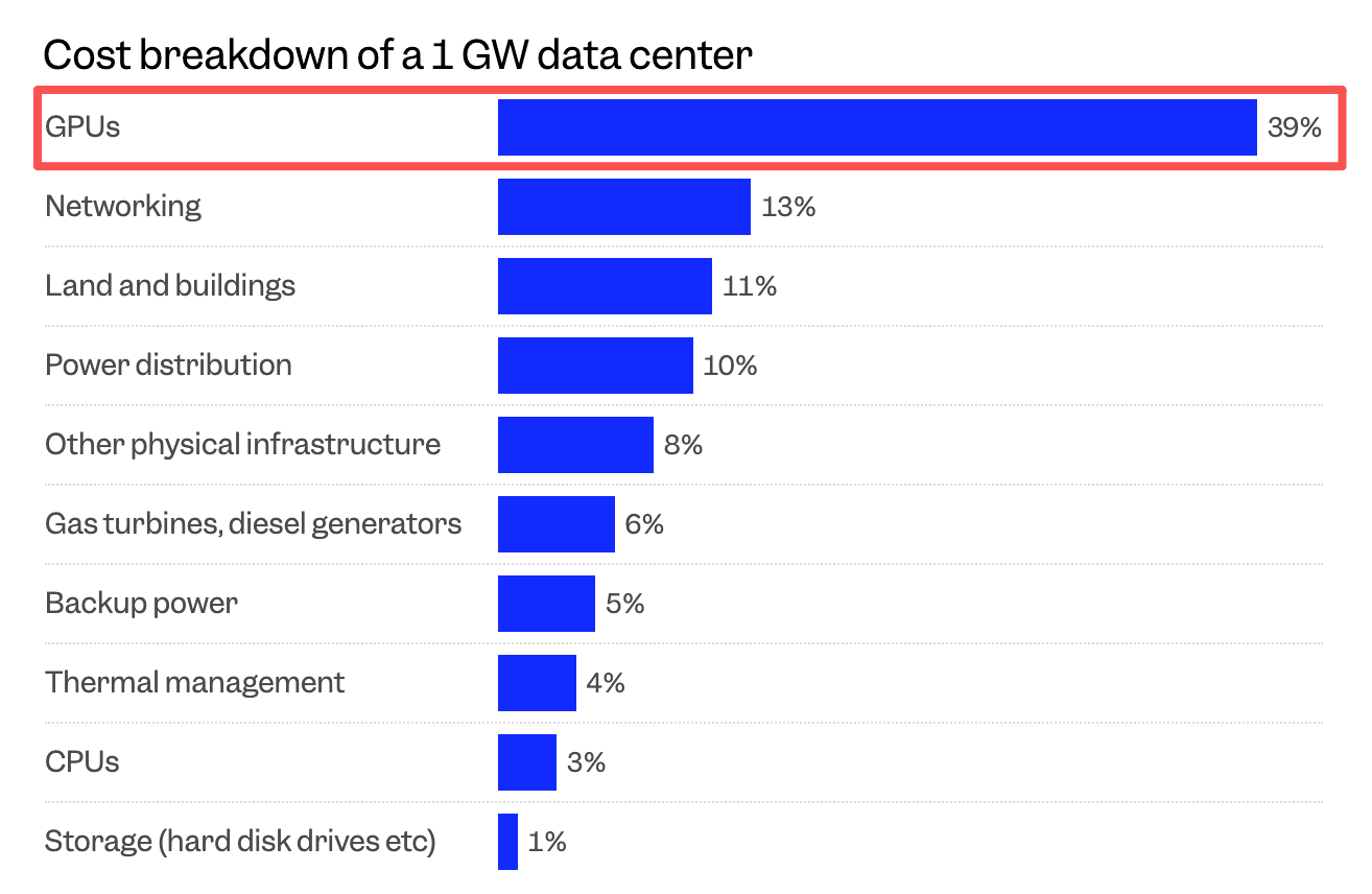 根据伯恩斯坦研究的最新分析,1吉瓦AI数据中心容量的建设成本约为350亿美元。听起来可能很夸张,但这实际上代表了AI的新经济基石。每1吉瓦的数据中心容量,不仅是电力的衡量单位,更是一个新兴工业生态系统的指标,它涵盖了半导体、网络设备、电力系统、建筑以及能源发电等领域。