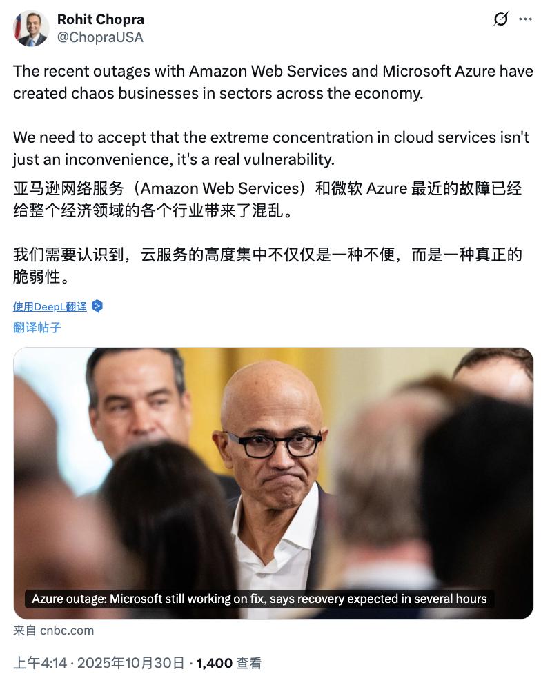 前美国联邦贸易委员会(FTC)委员、消费者金融保护局(CFPB)前主管 Rohit Chopra 在社交媒体上直言:“我们必须意识到,云服务的高度集中不仅带来不便,更是一种真实的系统性脆弱性。”