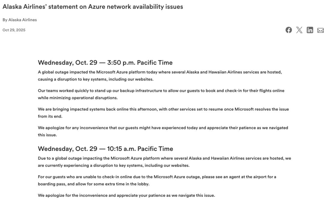 其中,阿拉斯加航空(Alaska Airlines)在其网上上发表声明称,由于微软 Azure 平台发生全球性宕机,托管在其上的阿拉斯加航空和夏威夷航空多项服务中断。航空公司提醒乘客:“无法在线值机的旅客请前往机场柜台领取登机牌,并在候机大厅预留更多时间。”