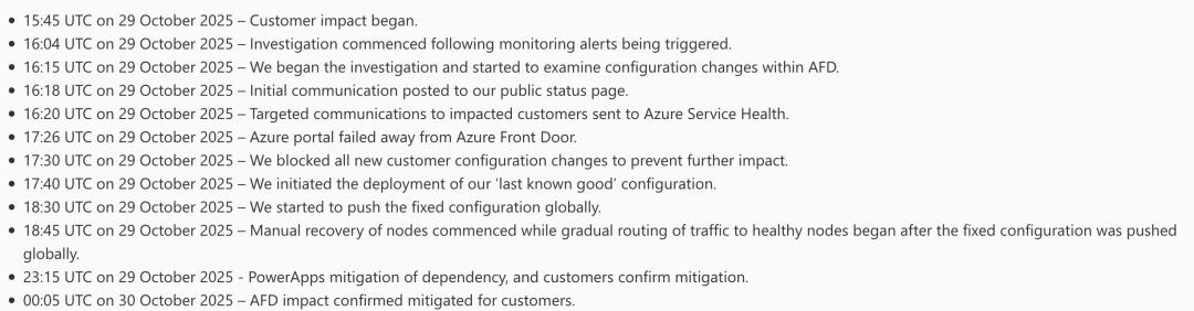 不过,微软也在初步报告中指出,“目前客户对 AFD 的配置修改仍处于暂时冻结状态。解除后我们将另行通知。虽然整体的错误率与延迟已恢复到事发前水平,但仍有少量客户存在尾部问题,我们正在持续修复中。相关更新将通过 Azure Service Health 直接推送。”