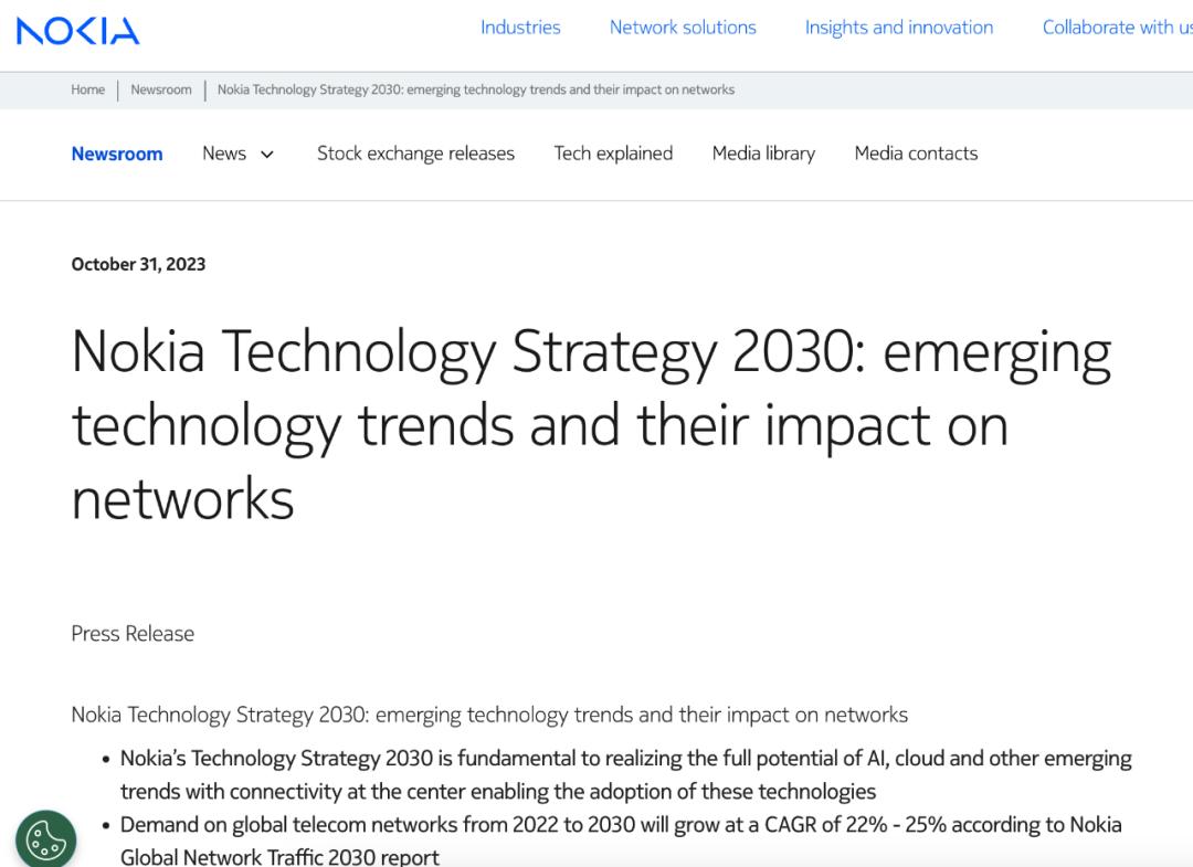 2023年,诺基亚发布了“2030技术战略”,严肃面对新兴技术及其对网络通信的影响。
