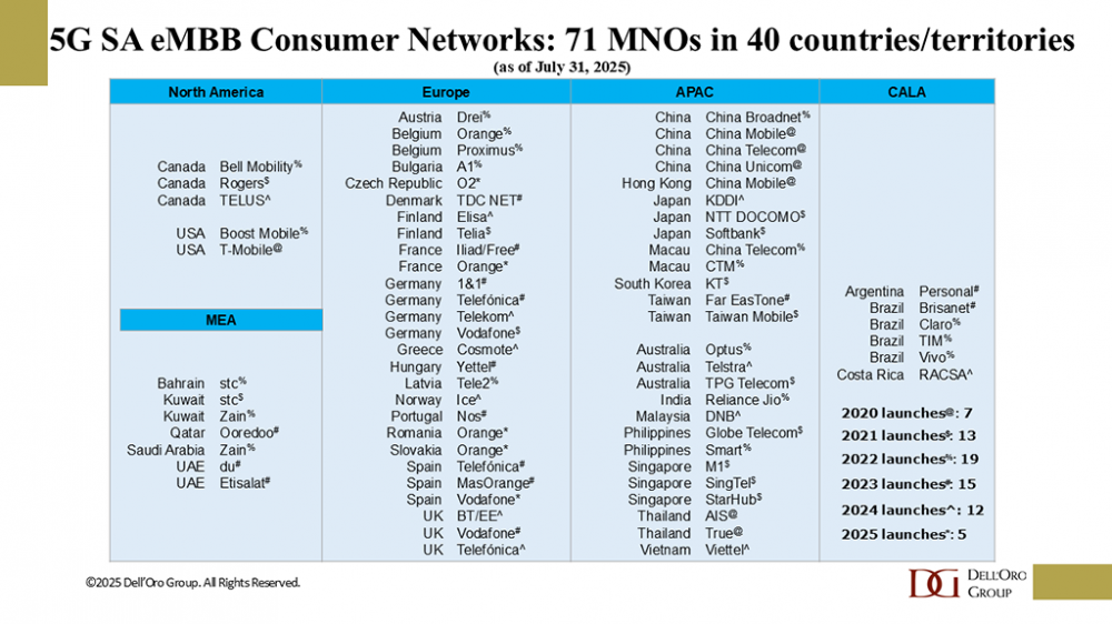 Dell'Oro Group发布的最新报告显示,目前全球40个国家/地区的71家移动网络运营商已经推出了5G SA网络。