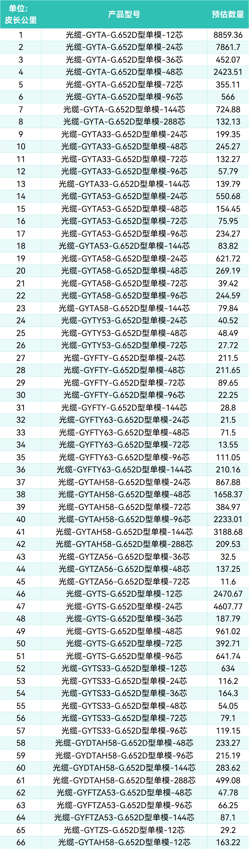 根据公告内容,本次集中采购涵盖66种不同型号的通信用室外光缆,全部采用G.652D型单模光纤,芯数从12芯至288芯不等,涉及GYTA、GYTA33、GYTA53、GYTA58、GYTAH58、GYTS、GYFTY、GYFTY63、GYDTAH58、GYTZA56、GYFTZA53、GYTZS等多个系列。预估采购总量达46388.5皮长公里,其中以GYTA-12芯(8859.36皮长公里)、GYTA-24芯(7861.7皮长公里)、和GYTS-24芯(4607.77皮长公里)等型号需求量居前。
