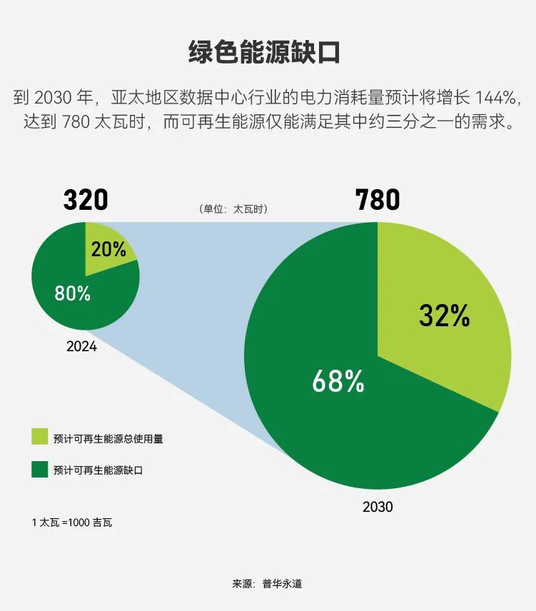 这类设施本就会消耗大量资源,如此紧锣密鼓的建设引发的一大担忧,就是会对现有电力和水资源供应造成压力。虽然一些数据中心建设者(如杨忠礼集团)正投资太阳能为设施供电,还有一些则将目光投向海上,例如三星电子近期便与OpenAI合作开发浮动数据中心,但普华永道的一份报告估计,到2030年,绿色能源最多只能满足不到三分之一的新增电力需求。“缺口非常明显,填补这一缺口至关重要,”报告称。