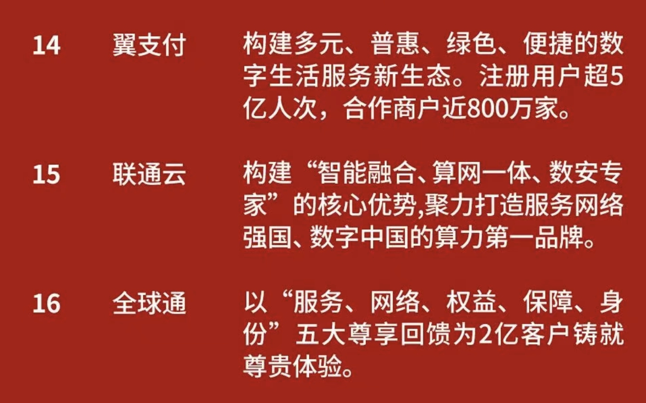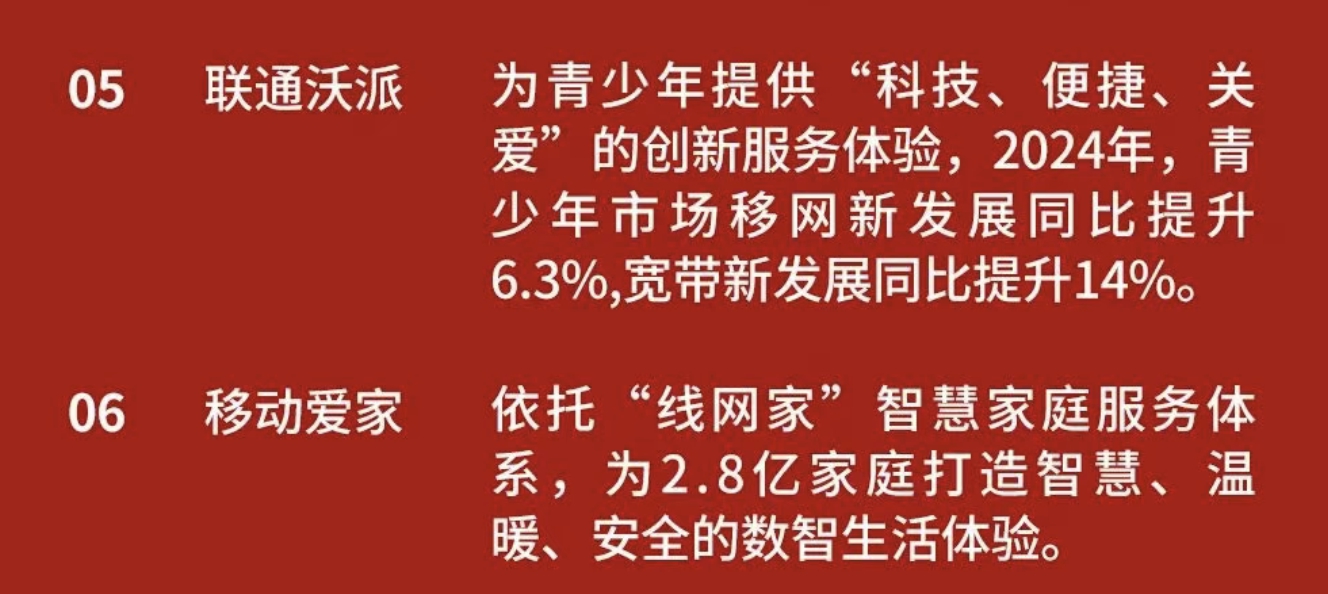 在此次发布的名单中,中国移动、中国联通、中国电信以及中国铁塔公司均有品牌入选,覆盖集团、产品和服务等多个类别,充分展现了通信企业在推动高质量发展和打造“国家名片”方面的卓越成就。