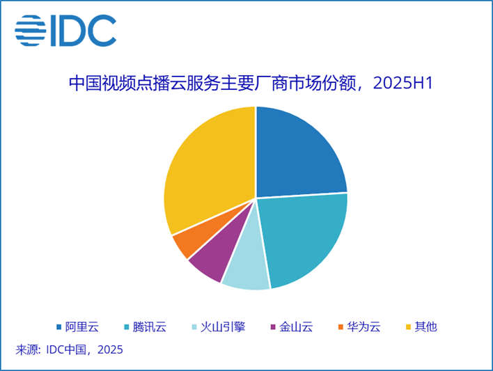 视频点播云服务(不含基础带宽)方面,阿里云、腾讯云、火山引擎、金山云、华为云同样表现强劲,合计份额升至68.4%。