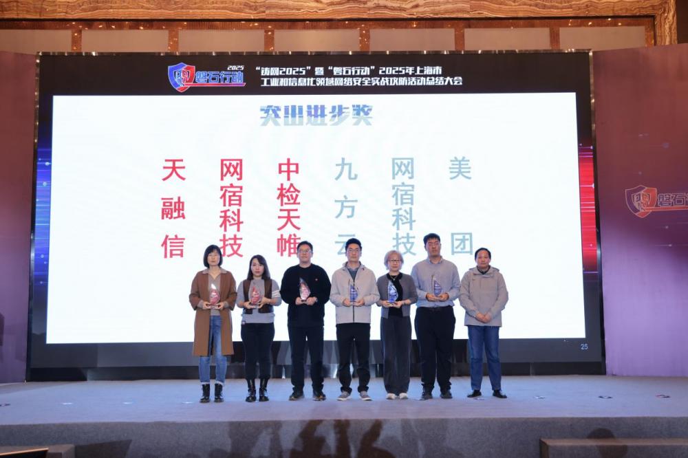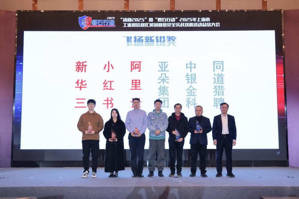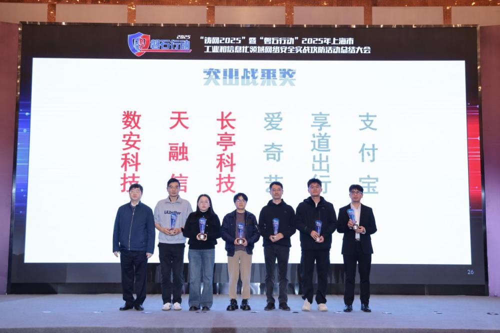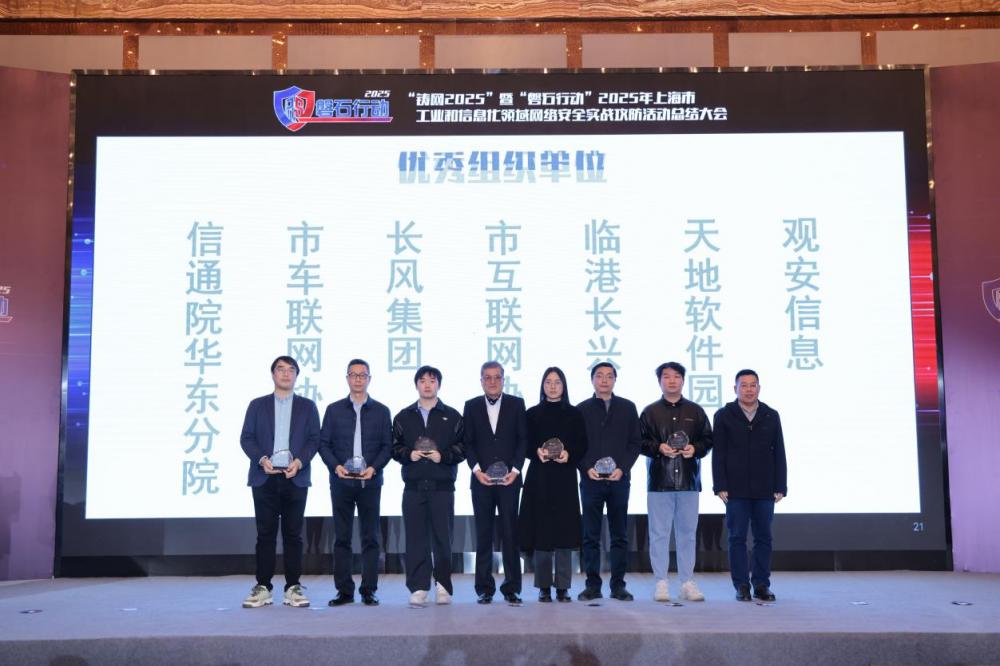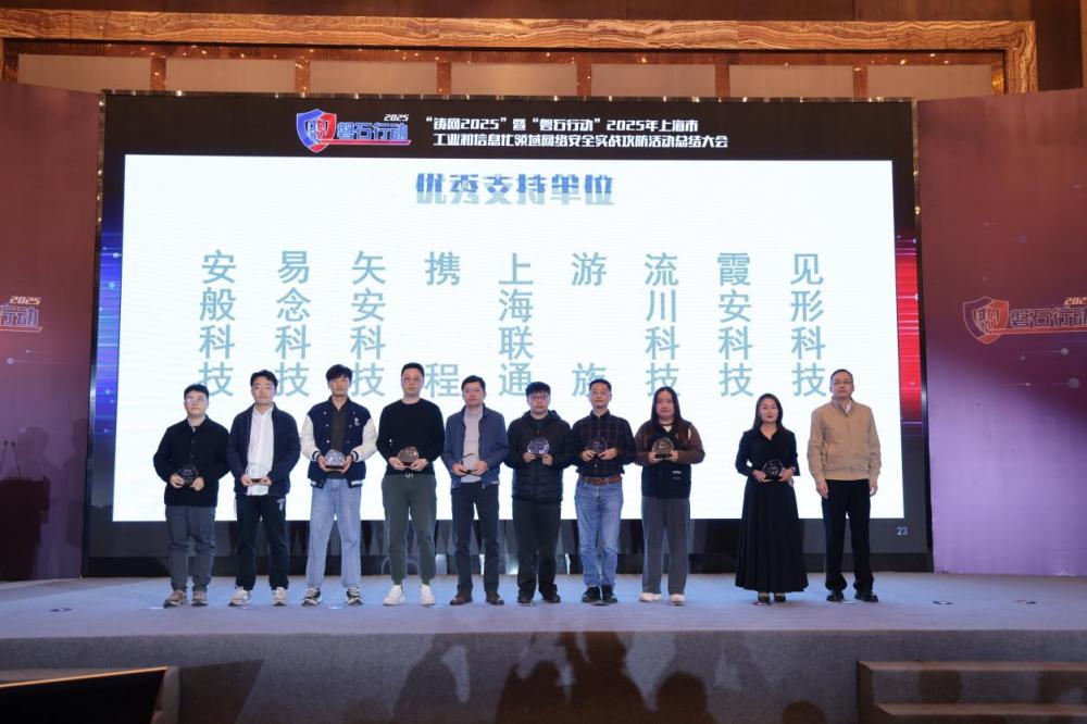 在颁奖仪式环节,与会领导分别为获奖单位颁发了优秀红方队伍、优秀蓝方队伍、优秀裁判单位、优秀组织单位、优秀支持单位,卓越应急奖、突出进步奖、突出战果奖、飞扬新锐奖、优秀技战法奖、优秀专项奖,并对2025年获得“磐石之星——上海市互联网行业网络与数据安全最具影响力企业和上海市互联网行业网络与数据安全本土最具实力企业”称号的企业进行表扬。(获奖单位名单附后)